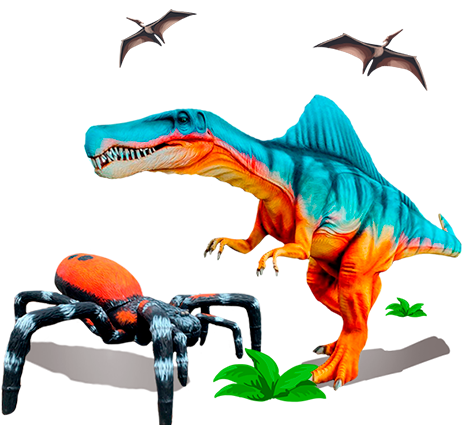 Самая большая фигура достигает высоты около 6 метров, а размер самого маленького динозавра – около 1 метра. Они дышат, моргают, рычат и двигаются! Всего в Парке представлено более 35 экспонатов, имеющих яркую окраску! Это не просто скульптуры, а сцены из реальной жизни животных доисторической эпохи. Вы можете фотографироваться с динозаврами. В тематических сценах парка задействованы: настоящий самолет ЯК-40, раритетный автомобиль Зил «Захар» 1949 года.